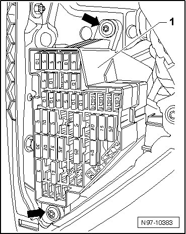 - Remove the bolts - arrows - and the fuse panel - 1 -. Be careful of the connected wires.