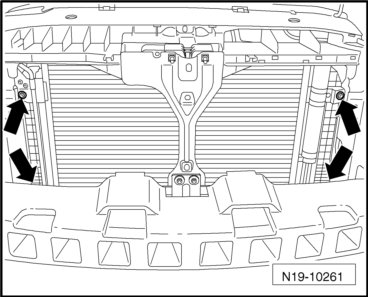 - Remove the A/C condenser bolts - arrows - from the charge air cooler.