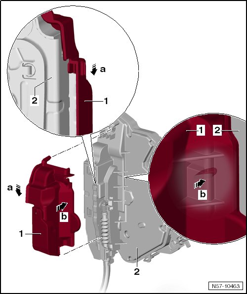 - Lock the cover - 1 - into the center of the door lock - 2 - - arrow b -.