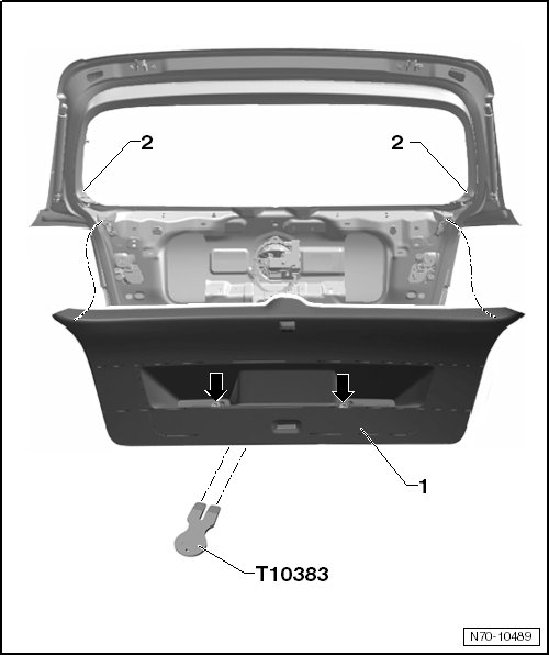 - Loosen the trim panel from the mounts in the rear lid - 1 - using the wedge (T10383). Start from lower edge of tailgate.
