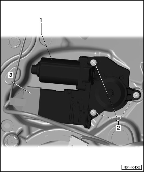 - Install the window regulator motor - 1 - and pull door window up and down so that splines are located better between motor and cable drum.