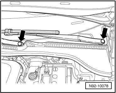 - Place the wiper arms on the wiper arm shafts in the approximate park positions and tighten the nuts - arrows - by hand.