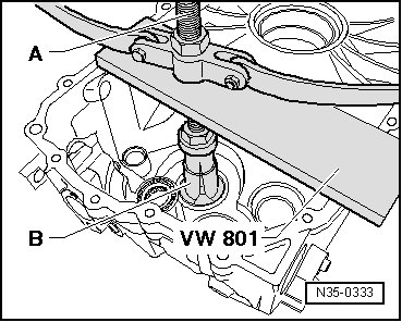- In the case of protruding housing edges: Place several washers on the clutch housing (total thickness: 8 mm) for the bolt - arrow - being used to secure the installation arbor (VW 792).