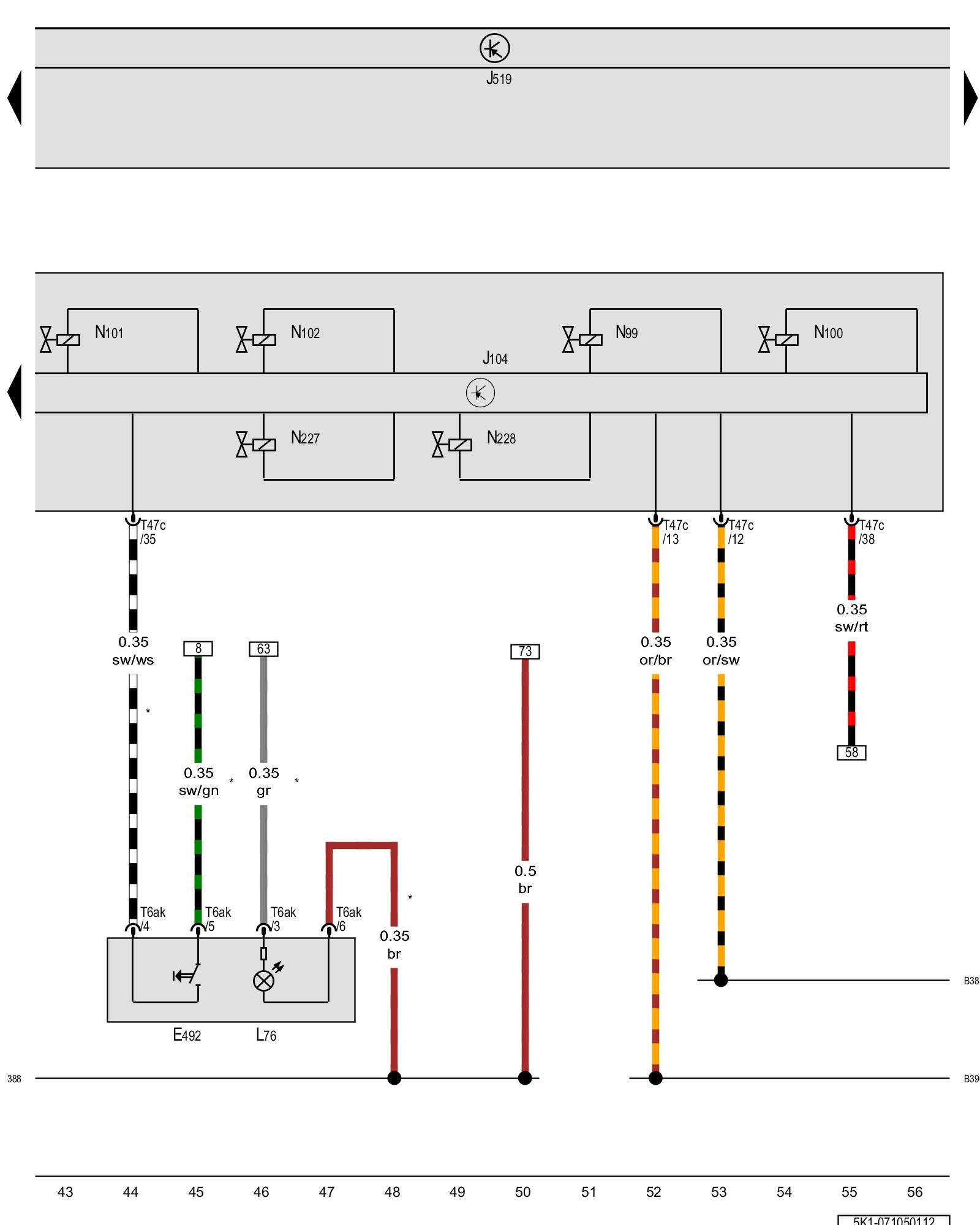 J104 - ABS control module, in the engine compartment, right Control modules in front part of vehicle - Overview of Control Modules [1][2]Diagrams