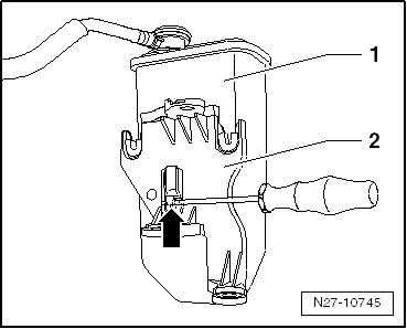 - Lift the tab - arrow - with a screwdriver and remove the EVAP canister - 1 - from the bracket - 2 -.