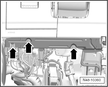 - Remove the bolts - arrows - from the knee airbag mount - 1 - on the right side.