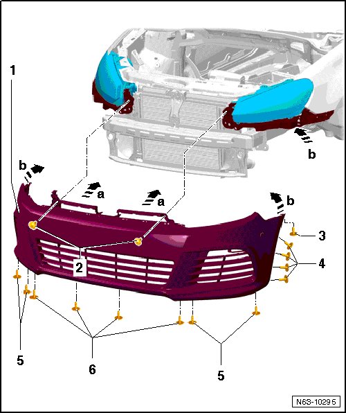 - Install the bolts - 2, 3, 4, 5, and 6 - and tighten them to the tightening specification. Refer to => [ Bumper Cover Overview, Golf R ] Bumper Cover Overview, Golf R.