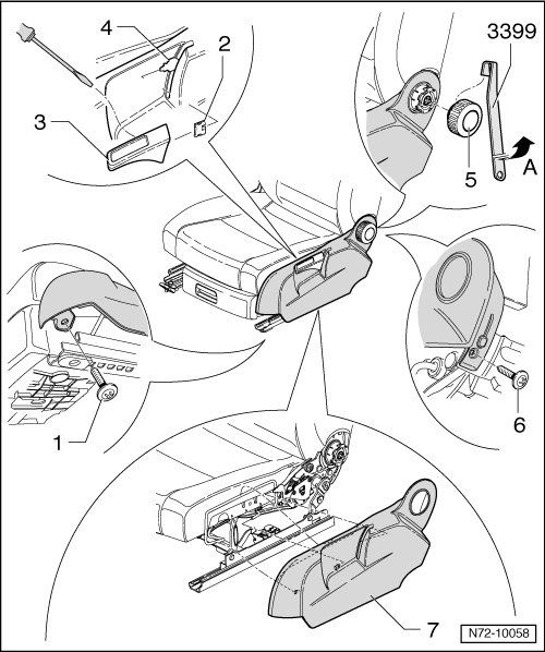 - Pry assembly tool (3399) outward - arrow A - and remove backrest adjusting wheel from seat.
