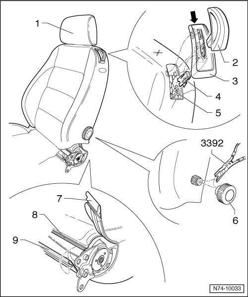 - Remove the lumbar support adjusting wheel - 6 - using the Pliers (3392).