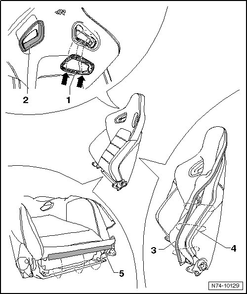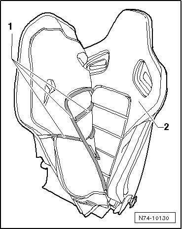 - Remove front bucket seat backrest. Refer to => [ Front bucket seat backrest, removing and installing ] Front bucket seat backrest, removing and installing