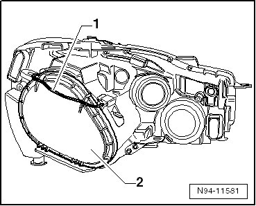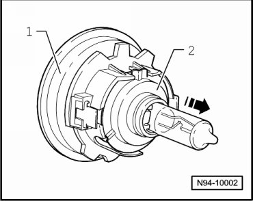 - Remove the low beam headlamp bulb - 2 - from the bulb socket - 1 - in - direction of arrow -.