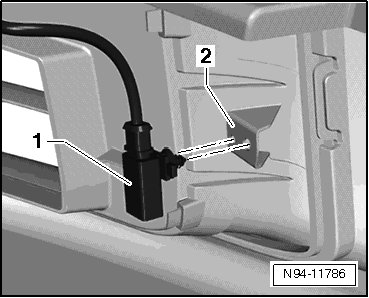 - Connect the connector - 1 - and attach the wiring harness to the front air guide grille - 2 -.