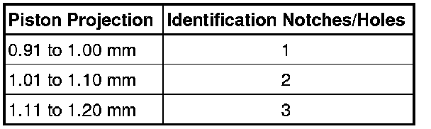When installing new pistons or working with a partial engine, check the piston projection in Top Dead Center (TDC) on all pistons. Depending on the piston projection, install the corresponding cylinder head gasket according to the following table.