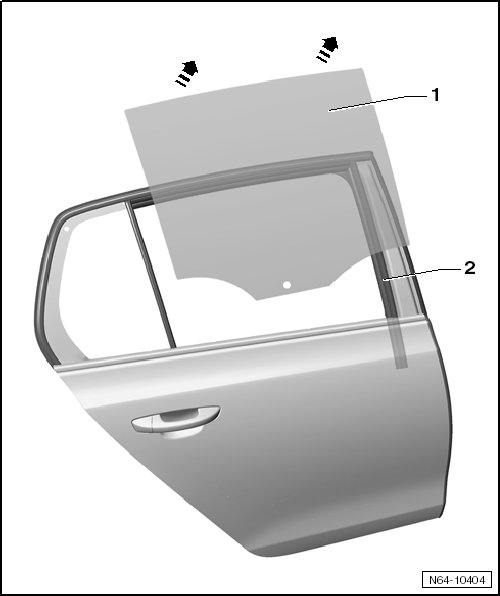 - Remove the door window - 1 - upward and at an angle - arrows - from the window shaft strip - 2 -.