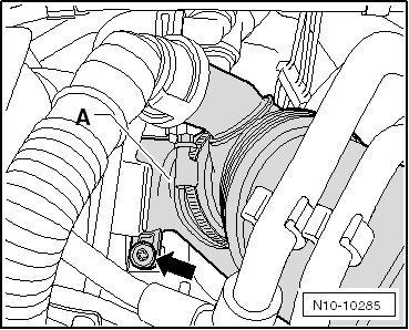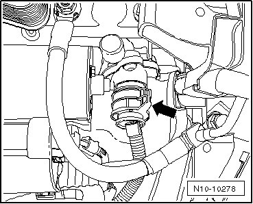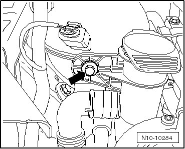 - Remove the bolt - arrow - and move the windshield washer fluid reservoir filler tube to the side.