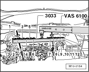 - Install the lifting tackle (3033) as follows and support the "engine/transmission subassembly" using the shop crane - load cap = 700-1200 KG (VAS 6100).