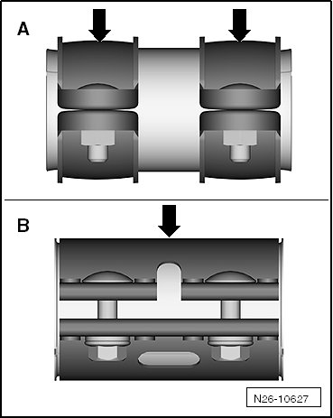 - Install the clamping sleeve so that the bolt end - arrow - does not project beyond the lower edge of the clamping sleeve.