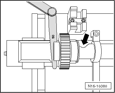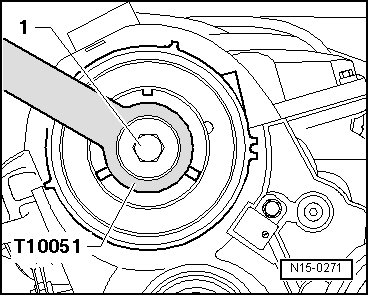 - Counter hold the hub using the camshaft gear counter-holder (T10051) and loosen the hub bolt - 1 -.