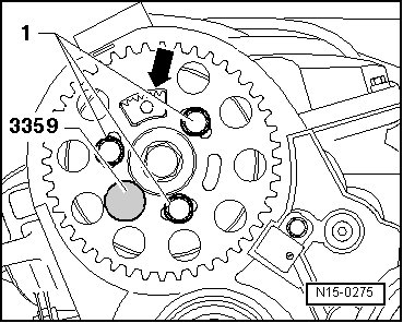 - Install the bolts - 1 - for the camshaft gear by hand to eliminate play.