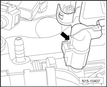 - Disconnect the connector from the charge pressure actuator position sensor - arrow - on the turbocharger and guide the wire out of the mounts.