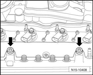 - Remove the coolant line bolts - arrows - from the intake manifold and lay the line in front of the intake manifold.
