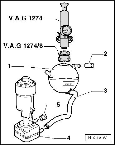 - Install the cooling system tester (V.A.G 1274) with the adapter (V.A.G 1274/8) onto the expansion tank.