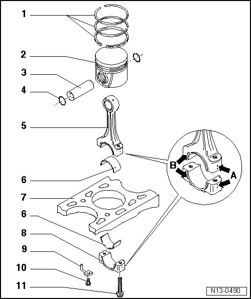 • Due to the separation procedure (cracking) of the connecting rod, the cap only fits in one position and only to the corresponding connecting rod.