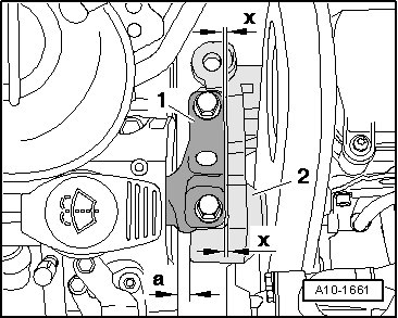 • The casting edge on the engine mount bracket - 2 - must be parallel to the engine mount support arm - 1 -.