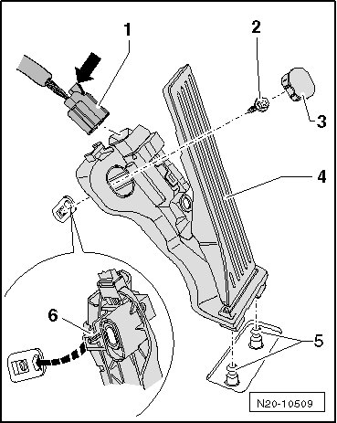 - Disconnect the connector - 1 - from the accelerator pedal module.