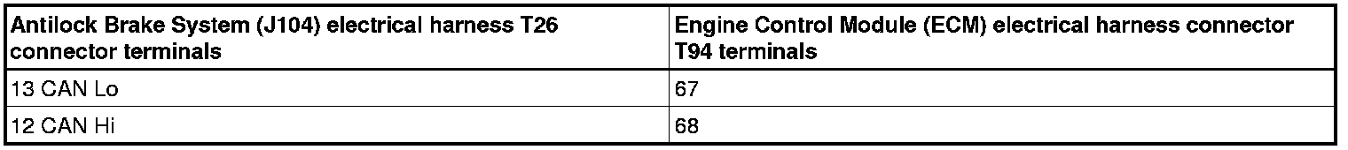 - Using a multimeter, measure the resistance between the CAN bus low and CAN bus high at the Antilock Brake System (J104) harness connector (with ALL other modules connected). Refer to Wiring Diagrams for Pin locations.