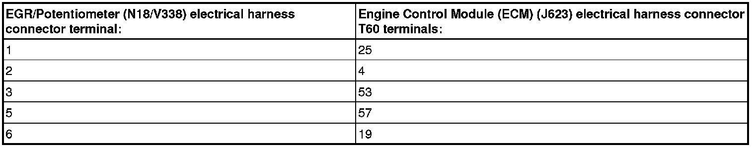 - Using a multimeter, check the EGR/Potentiometer (N18/V338) electrical harness connector terminal to the Engine Control Module (ECM) (J623) electrical harness connector T60 terminal for resistance. Refer to Wiring Diagrams for Pin locations.