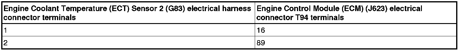 - Using a multimeter, check the Engine Coolant Temperature (ECT) Sensor (G83) electrical harness connector terminals to the Engine Control Module (ECM) (J623) electrical harness connector T94 terminals for a circuit fault. Refer to Wiring Diagrams for Pin locations.