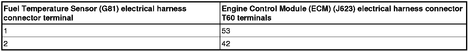 - Using a multimeter, measure the resistance of circuits between the Fuel Temperature Sensor (G81) and the Engine Control Module (ECM) (J623) electrical harness connectors. Refer to the applicable wiring diagram. Refer to Wiring Diagrams for Pin locations.