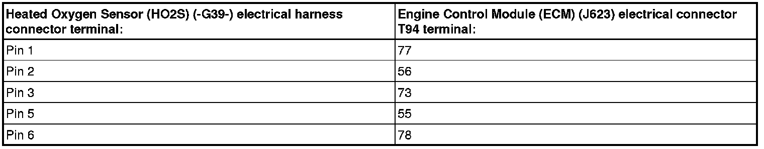 - Using a multimeter, check the Heated Oxygen Sensor (HO2S) (-G39-) electrical harness connector terminals to the Engine Control Module (ECM) (J623) electrical connector T94 for an open circuit. Refer to Wiring Diagrams for Pin locations.