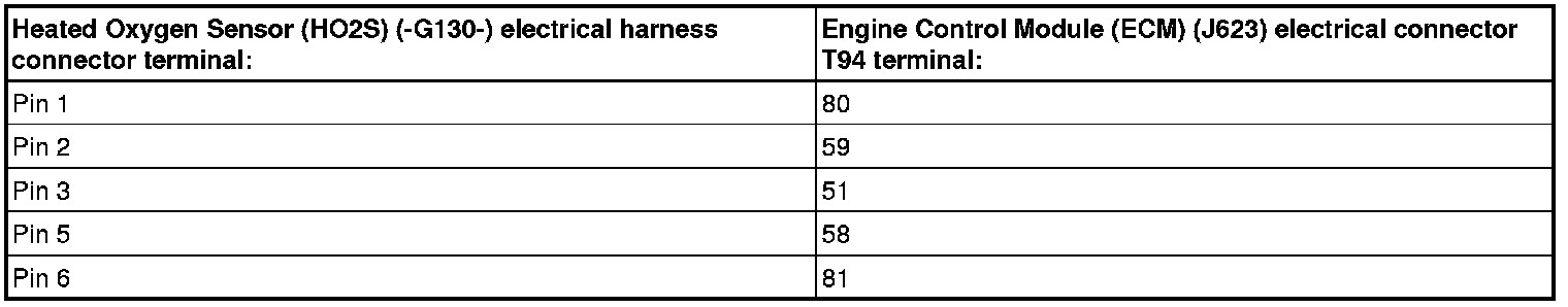 - Using a multimeter, check the Heated Oxygen Sensor (HO2S) (-G130-) electrical harness connector terminals to the Engine Control Module (ECM) (J623) electrical connector T94 for an open circuit. Refer to Wiring Diagrams for pin locations.