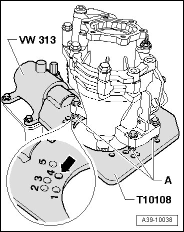 - Mount the bevel box on the hole marked with the number - 4 - - arrow - in the gearbox support (T10108).
