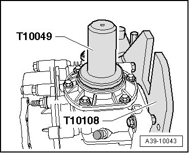 - Secure the bevel box output flange using the stop plate (T10108/1) by installing the M10 x 30 bolts - arrows -.