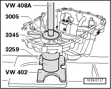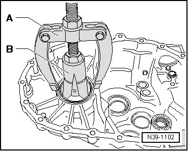 - Press out the outer race/tapered roller bearing with a shim from the clutch housing.