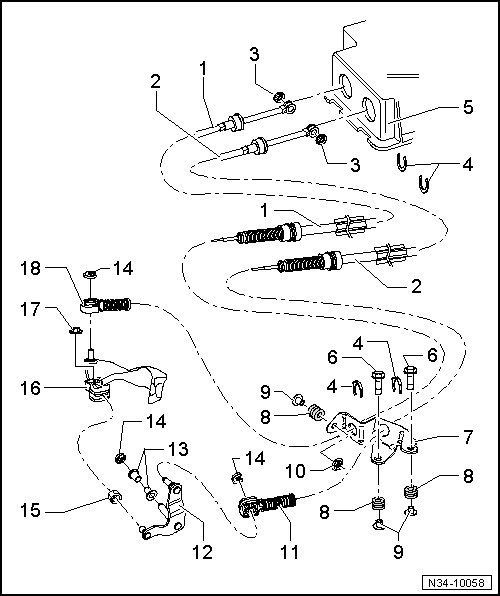 - Attach the shift cable with lock washer - 3 - (metal relay lever) and selector cable with lock washer - 4 -.