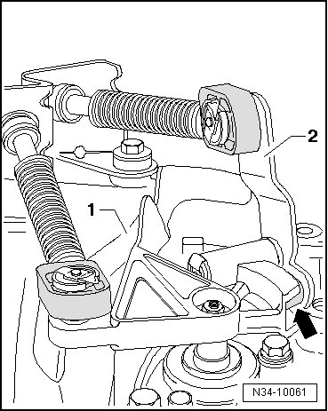 - Apply a small amount of grease onto the pins on the transmission shift lever - arrows - - 1 - and on the relay lever - 2 -.