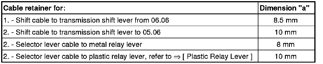 If a plastic relay lever is installed, then it must be installed together with the cable retainer. Refer to => [ From 03.07 - Plastic Relay Lever ] Plastic Relay Lever.