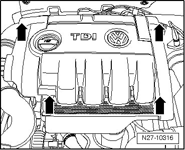 - Disconnect hose - arrow - from air filter housing and remove it.