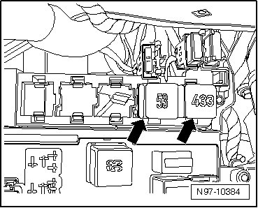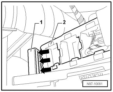 - Release retainer - 1 - for relay panel in direction of - arrow - and remove relay panel.