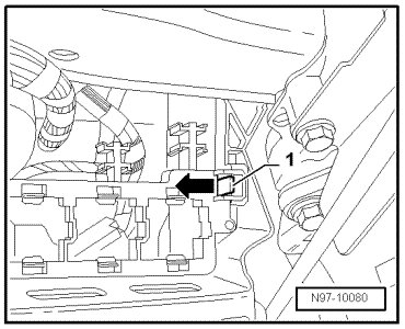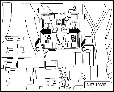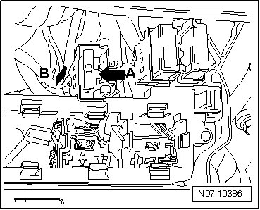 - Disengage bracket - arrow A - and pull off bracket with fuse from relay carrier in - direction of arrow B -.