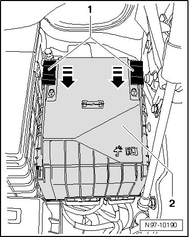 - Slide securing bracket - 1 - in - direction of arrow - and remove cover of E-box - 2 - upward.