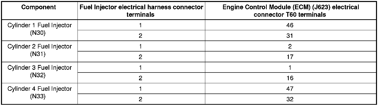 - Using a multimeter, check the Fuel Injector electrical harness connector terminals to the Engine Control Module (ECM) (J623) electrical harness connector T60 terminals for a short to ground or voltage, high resistance or an open circuit. Refer to Wiring Diagrams for Pin locations.