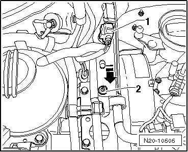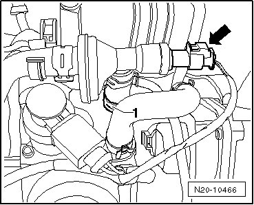 - Disconnect the connector from the fuel temperature sensor - arrow -, loosen the clamp - 1 - and remove the fuel supply hose from the high pressure pump.