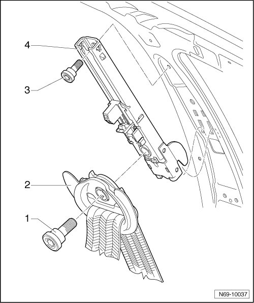 - Remove bolt - 3 - (20 Nm) and separate belt height adjuster - 4 - from mounting in carrier plate.