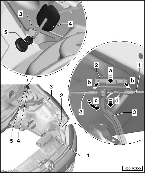 - Turn the release cable - 3 - 90° - arrow c - and remove it from the mount - 1 - in the - direction of arrow d -.