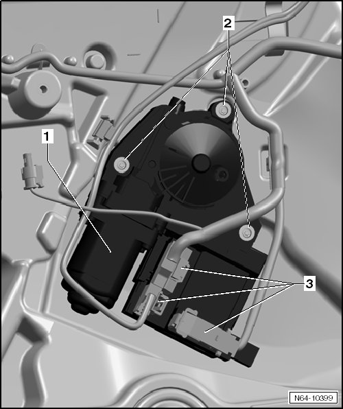 - Install the window regulator motor - 1 - and pull door window up and down so that splines are located better between motor and cable drum.